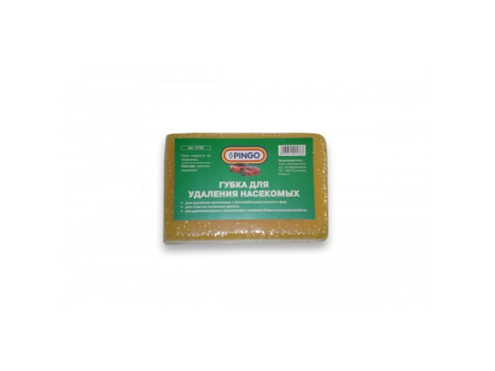 Губка для удаления насекомых "Pingo" выполнена из пенополиуретана. Губка предназначена для удаления насекомых с автомобильных стекол и фар, для очистки колесных дисков, для удаления сильных загрязнений с тканевой обивки салона автомобиля.