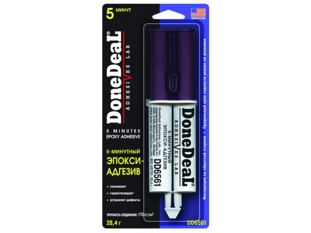 5-минутный эпокси-адгезив DD6561 (28,4г, прозрачный) — быстро и надежно склеивает в любых сочетаниях металлы, сплавы, большинство пластиков, керамику, стекло, дерево, различные строительные материалы. После полимеризации безвреден, устойчив к воздействию нефтепродуктов, воды растворителей. Обладает высокими эксплуатационными характеристиками, не дает усадки, выдерживает постоянные и переменные нагрузки в интервале температур от -550С до +1250С. Время схватывания — 4-6 минут, время полимеризации — 30мин, время полной полимеризации — 16 часов.