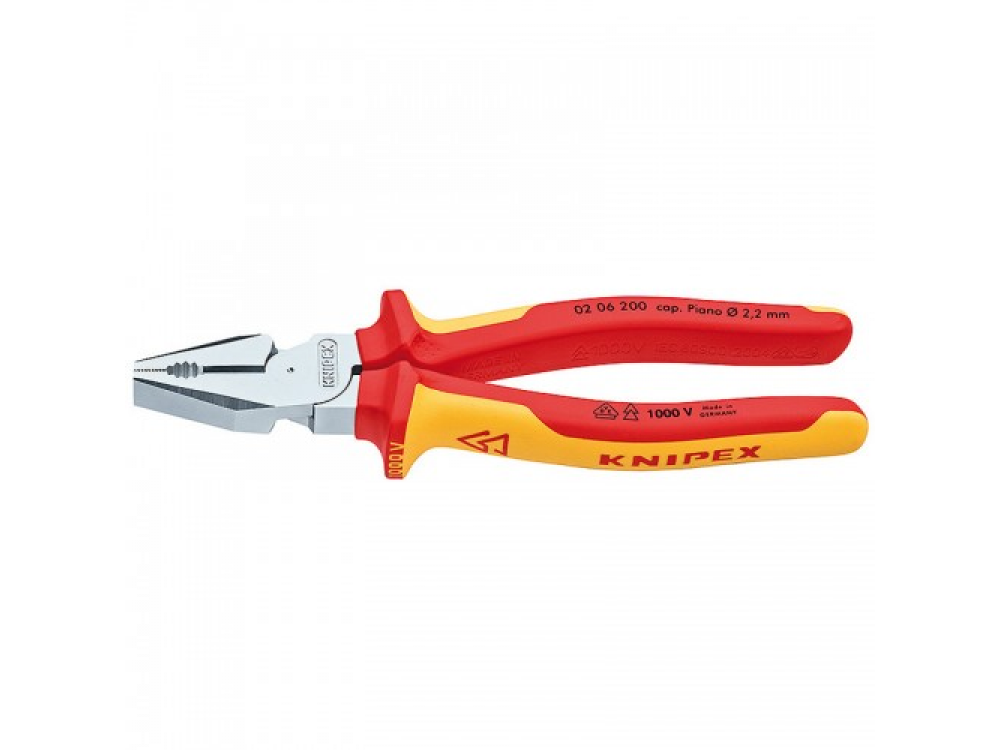 Защита от коррозии: головка силовых пассатижей KNIPEX KN-0206200 хромирована для защиты от коррозии. Режущие кромки инструмента дополнительно закалены ТВЧ до твердости 63 НRC. Безопасность: рукоятки инструмента снабжены специальными двухкомпонентными чехлами для исключения скольжения и защиты рук оператора во время работы. Малый вес - 0.343 кг снижает энергоемкость работы. Длительный срок эксплуатации достигается закалкой кованой инструментальной стали, используемой при изготовлении инструмента. Возможность работы с медными и алюминиевыми многожильными кабелями диаметром до 13 мм и площадью сечения до 25 мм?, твердой проволокой диаметром до 2.8 мм и проволокой из пружинной стали диаметром до 2.2 мм. Захватные губки пассатижей имеют специальные зубцы для более надежного удержания круглых и плоских деталей. Оптимизированное передаточное отношение и передача усилия способствуют уменьшению силы воздействия на 35% по сравнению с обычными пассатижами. Данный инструмент испытан на соответствие нормам VDE. Механические узлы пассатижей соответствует Закону о безопасности техники и продукции (GPSG). Возможно использование инструмента для электротехнических работ с переменными токами напряжением до 1000 В и с постоянными токами напряжением до 1500 В. Длина инструмента составляет всего 200 мм, что упрощает его хранение и транспортировку. Технические характеристики