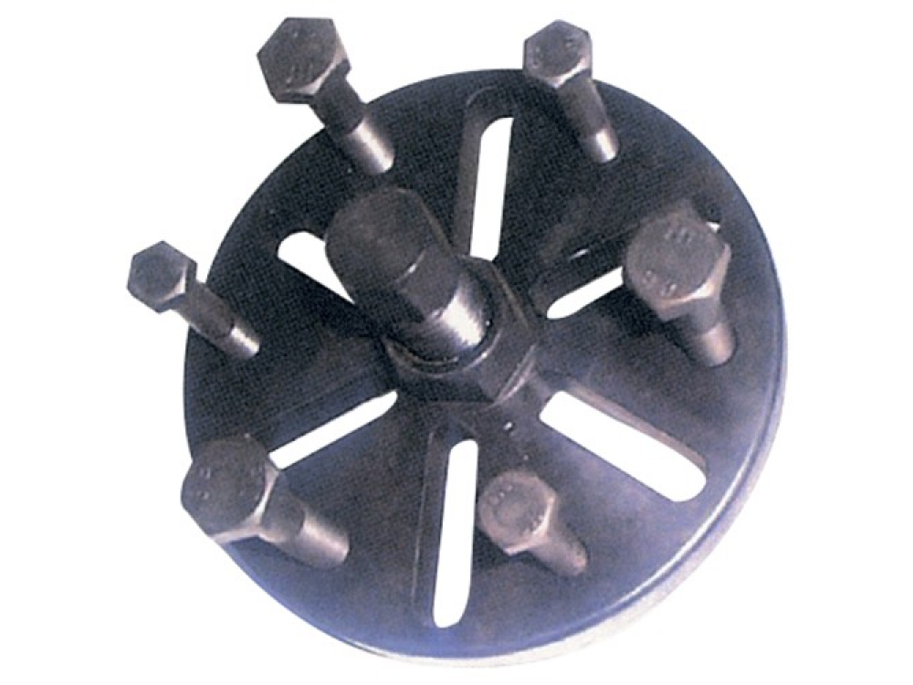Съемник приводных деталей, шкивов, маховиков двигателя автомобиля, в котором в качестве захватов используются болты, устанавливаемые в технологические резьбовые отверстия демонтируемой детали. Применяется для демонтажа зубчатых колес приводов ГРМ, водяного насоса автомобилей TOYOTA, FORD и аналогичных.